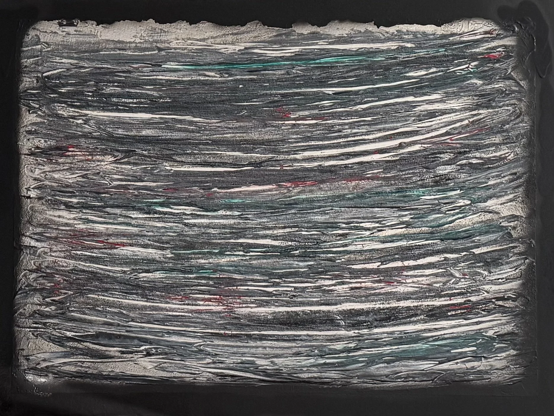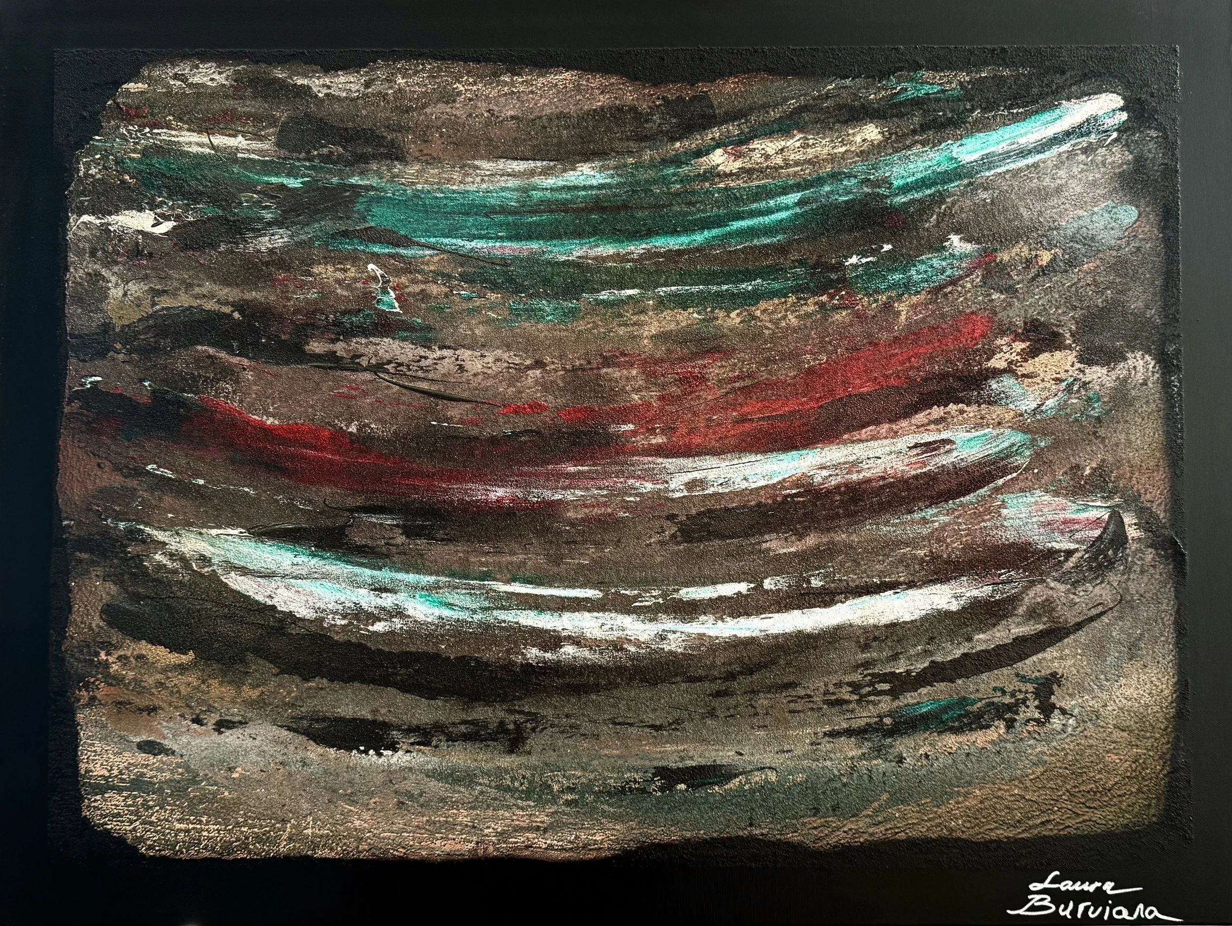 Les lignes horizontales évoquent la respiration et le flux, tandis que les tensions verticales ancrent la surface dans une mémoire plus dense, presque tellurique.